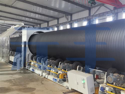 然后進入聚乙烯纏繞工序。噴涂聚氨酯的鋼管在工裝上勻速前進,擠出機根據工程設計要求擠出相應寬度和厚度的聚乙烯片狀材料,隨著噴涂聚氨酯的鋼管勻速行進,疊加纏繞在聚氨酯保溫層表面。由于聚氨酯噴涂工藝形成的泡沫層表面粗糙,使得熔融的聚乙烯片材可以通過擠壓嵌入保溫層表面的微小凹陷處,增加了聚氨酯泡沫與聚乙烯之間的粘結力,保證聚氨酯噴涂保溫管的形成 “三位一體”的緊密結構。